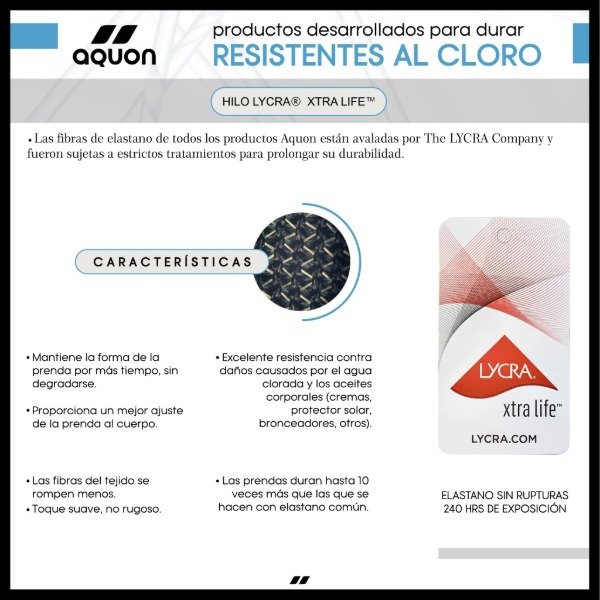 Las fibras de elastano de todos los productos Aquon están avalados por The Lycra Company® y fueron sujetas a estrictos tratamientos para prolongar su durabilidad.