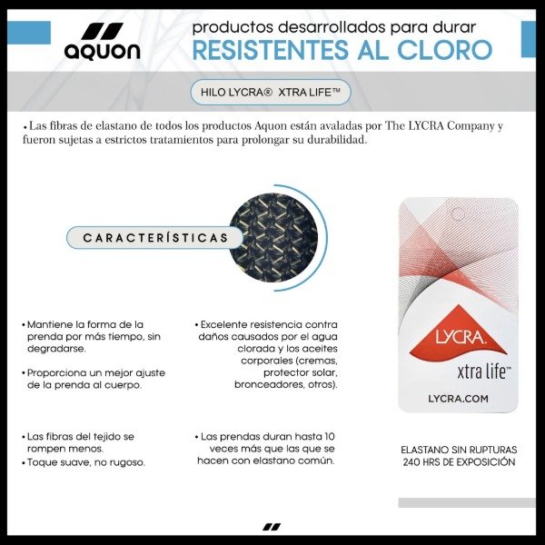 Las fibras de elastano de todos los productos Aquon están avalados por The Lycra Company® y fueron sujetas a estrictos tratamientos para prolongar su durabilidad.