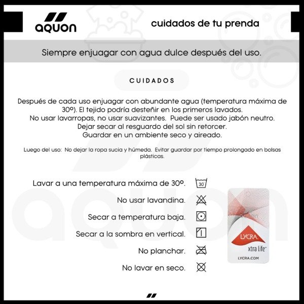 Las fibras de elastano de todos los productos Aquon están avalados por The Lycra Company® y fueron sujetas a estrictos tratamientos para prolongar su durabilidad.